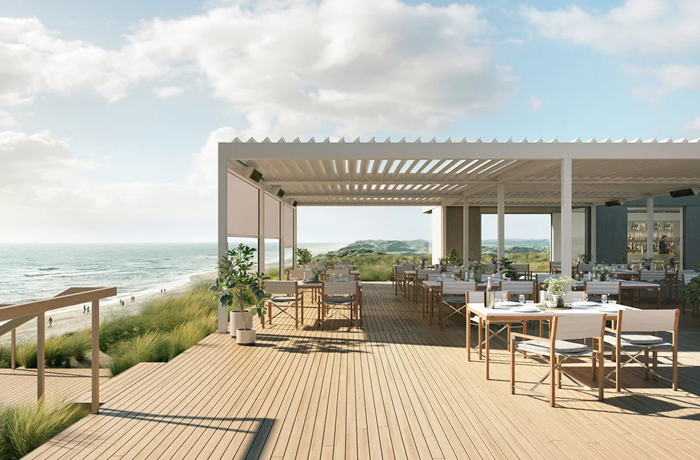 Lamaxa L50 Line ist die ideale Lösung, um große Flächen verschatten und vor Witterung schützen zu lassen. Dazu können mehrere Lamaxa Dachsysteme mit nur einem mittigen Pfosten an der langen oder kurzen Seite aneinandergereiht werden. Und zwar freistehend, mit Fassadenanbindung oder in Sternform. Wie Sie sich auch entscheiden: Sie schaffen immer ein einladendes Flair für Ihre Gäste.